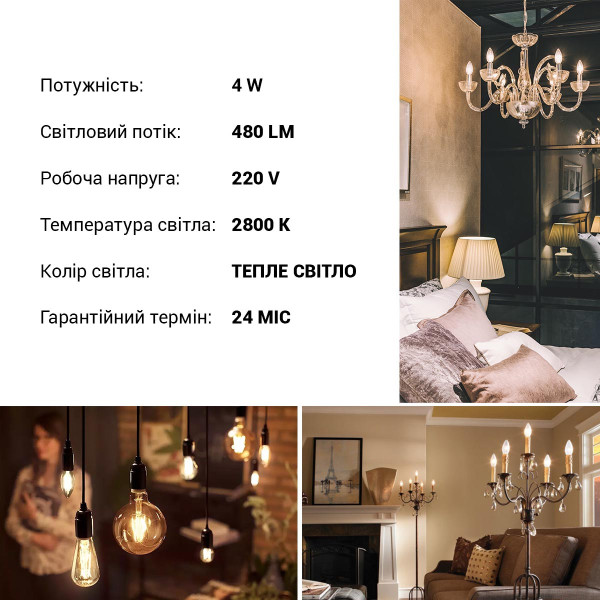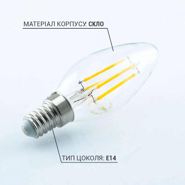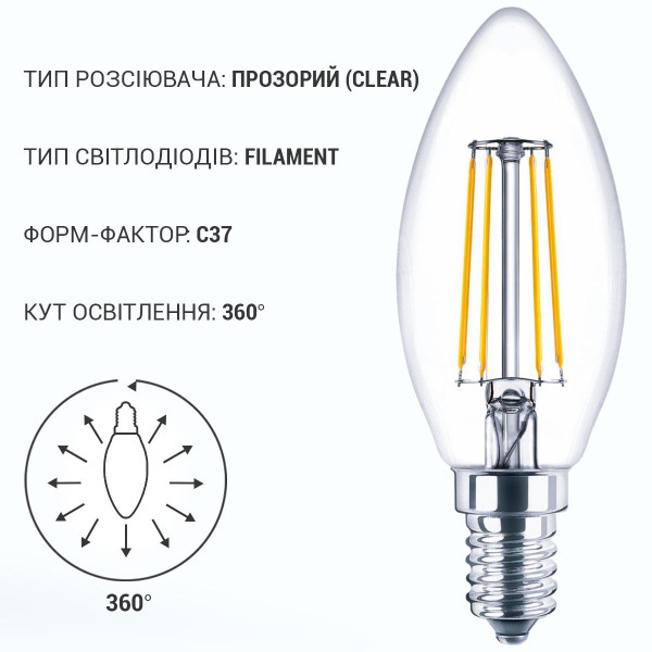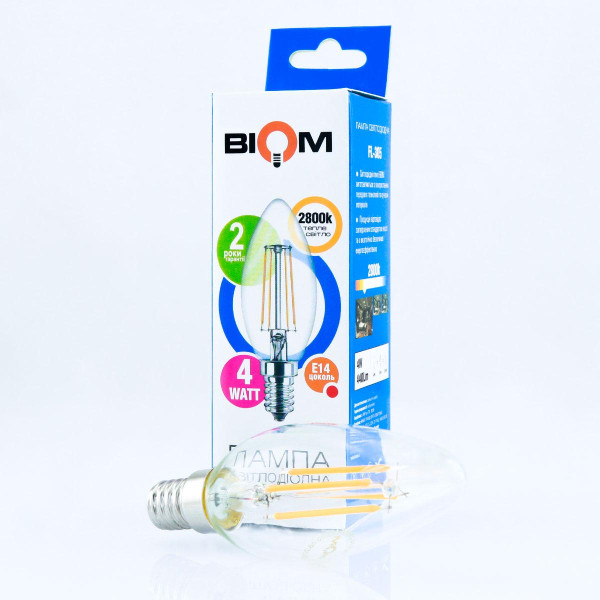 Светодиодная лампа Biom филамент C37 4W 360Lm 2800-3200K 220V E14 Clear (FL-305), 100001246