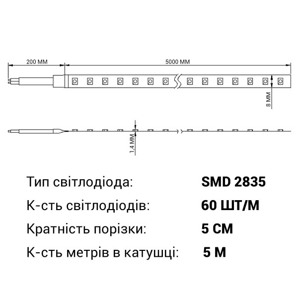 Світлодіодна стрічка RISHANG 60-2835-12V-IP33 5,4W 410Lm 4000К 5м (R0860TA-C-NW) , 100022334